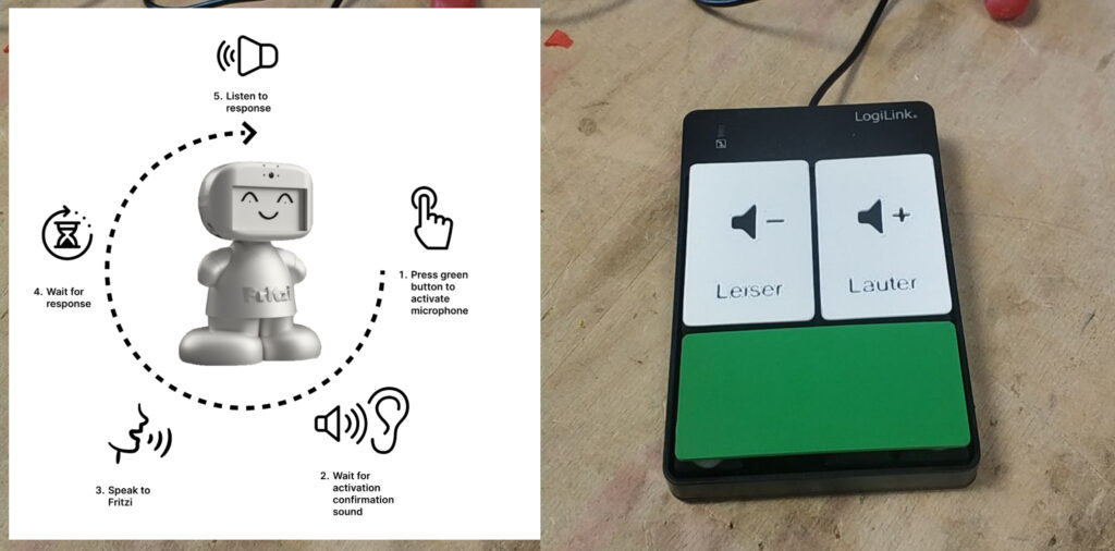 Users could interact with Fritzi by pressing a single button on a modified USB numpad to activate the listening mode. This design choice eliminated the need for a wake word (like “Alexa”) and simplified the interaction process, as older adults expressed discomfort with repeated wake commands.