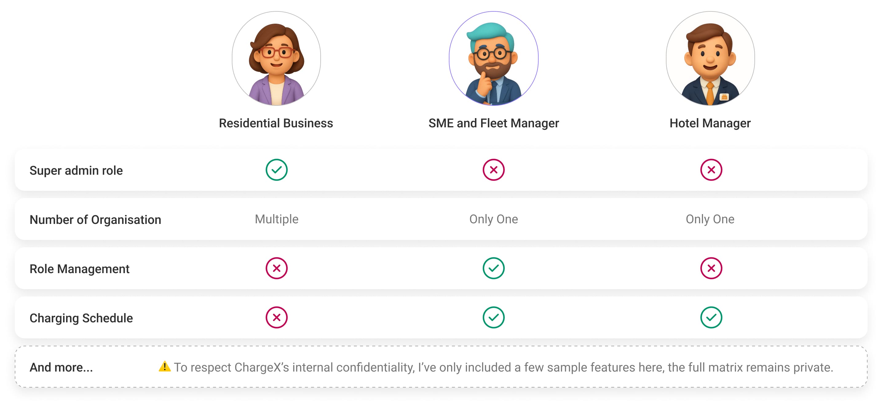 The existing tool was built six years ago for a single admin type, but ChargeX had since grown into serving SMEs, fleet managers, residential admins, and hotels. Each had different workflows, yet the old dashboard treated them all the same. I knew guessing wouldn’t cut it, I needed evidence.