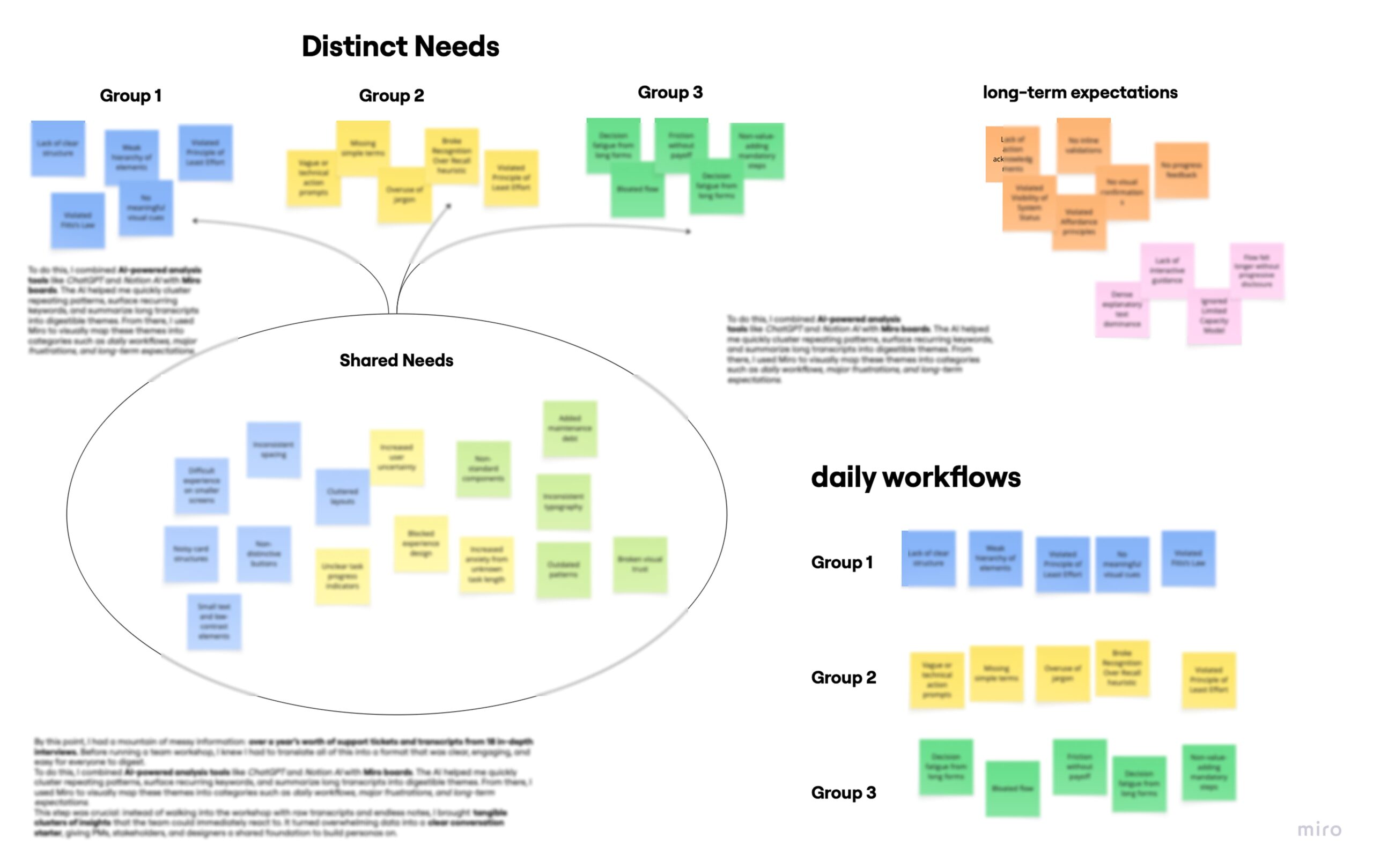 Afterward, I Turned Raw Tickets and 18 Interview Transcripts into Clear Insights Using ChatGPT, Notion AI, and Miro to Prep for the Persona Workshop with the team