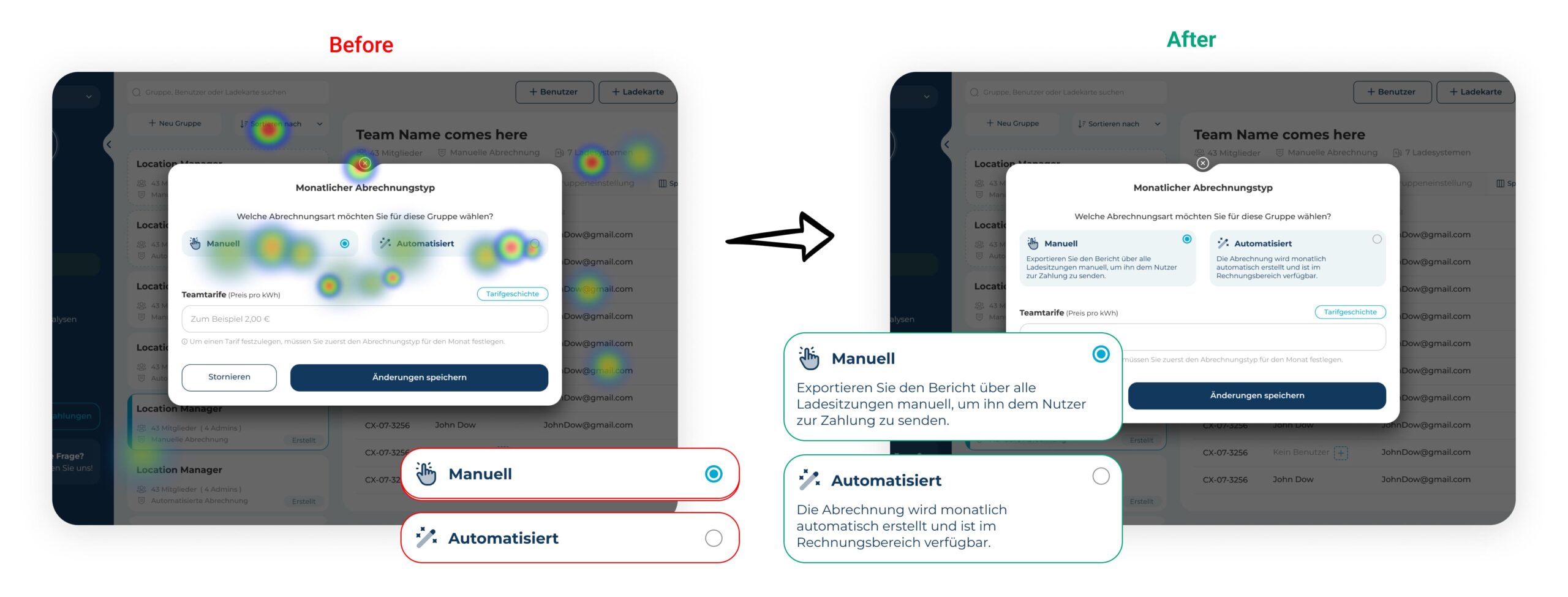 many weren’t sure whether manual or automated billing was the right choice for their teams. Since this is a new feature with real financial impact, the risk of misconfiguration was high. To solve this, I added short, plain-language explanations under each option (e.g., Automated → invoices generated monthly without admin effort). This small addition gave admins the confidence to make the right choice without second-guessing.