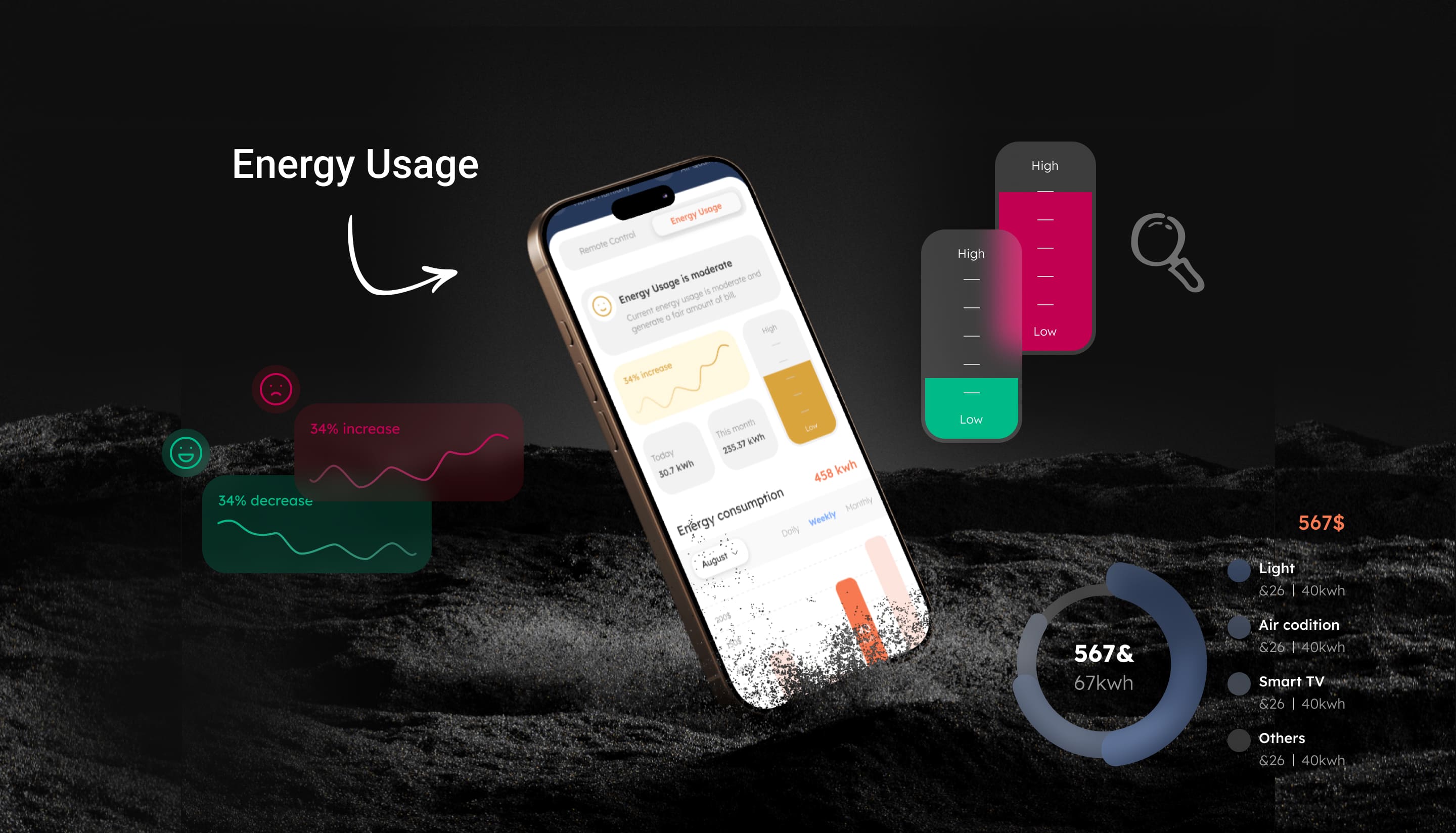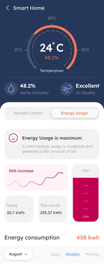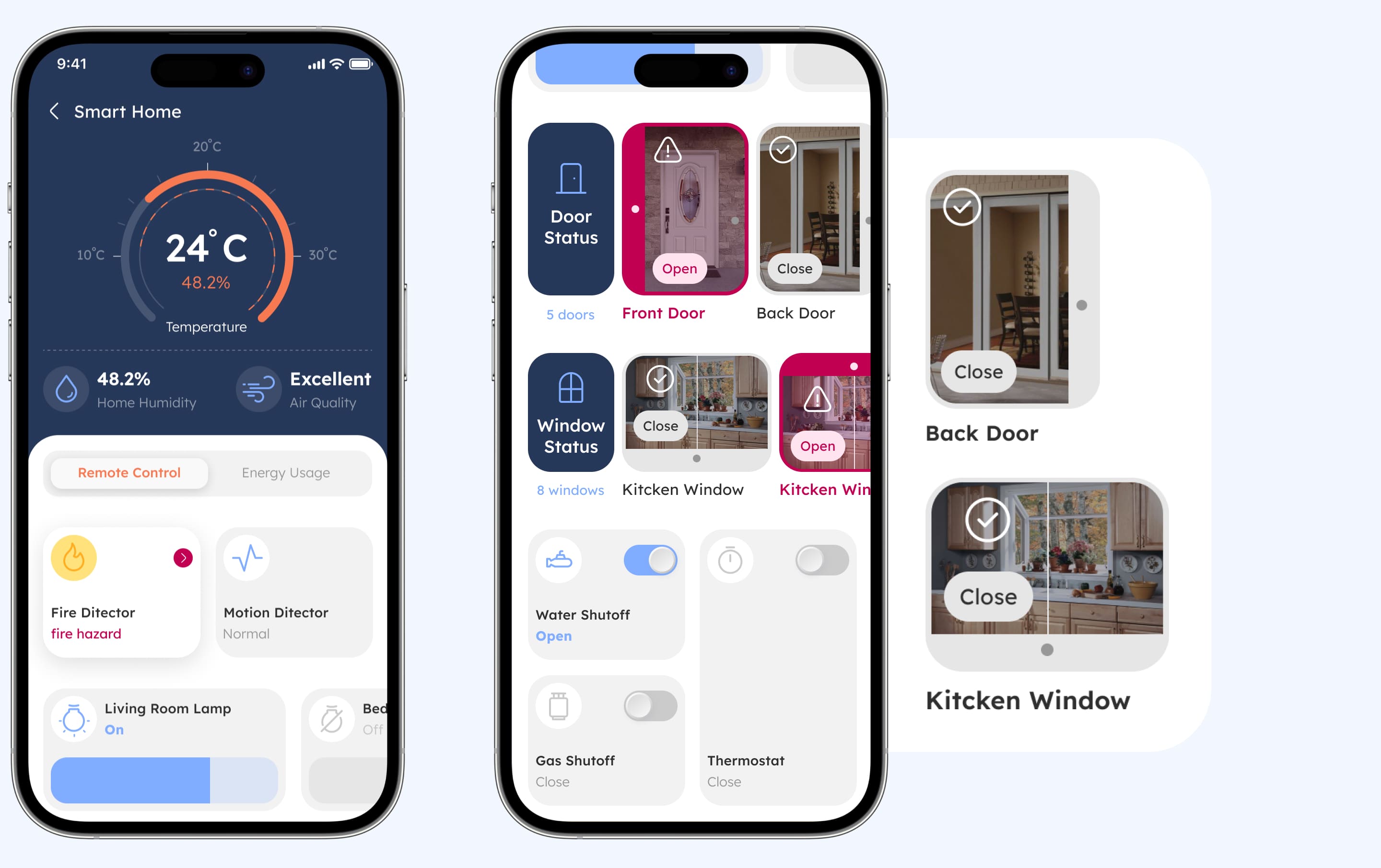 Toggles and sliders let users quickly shut off water, gas, or adjust lights and thermostat, while door and window visuals show real open/closed status.