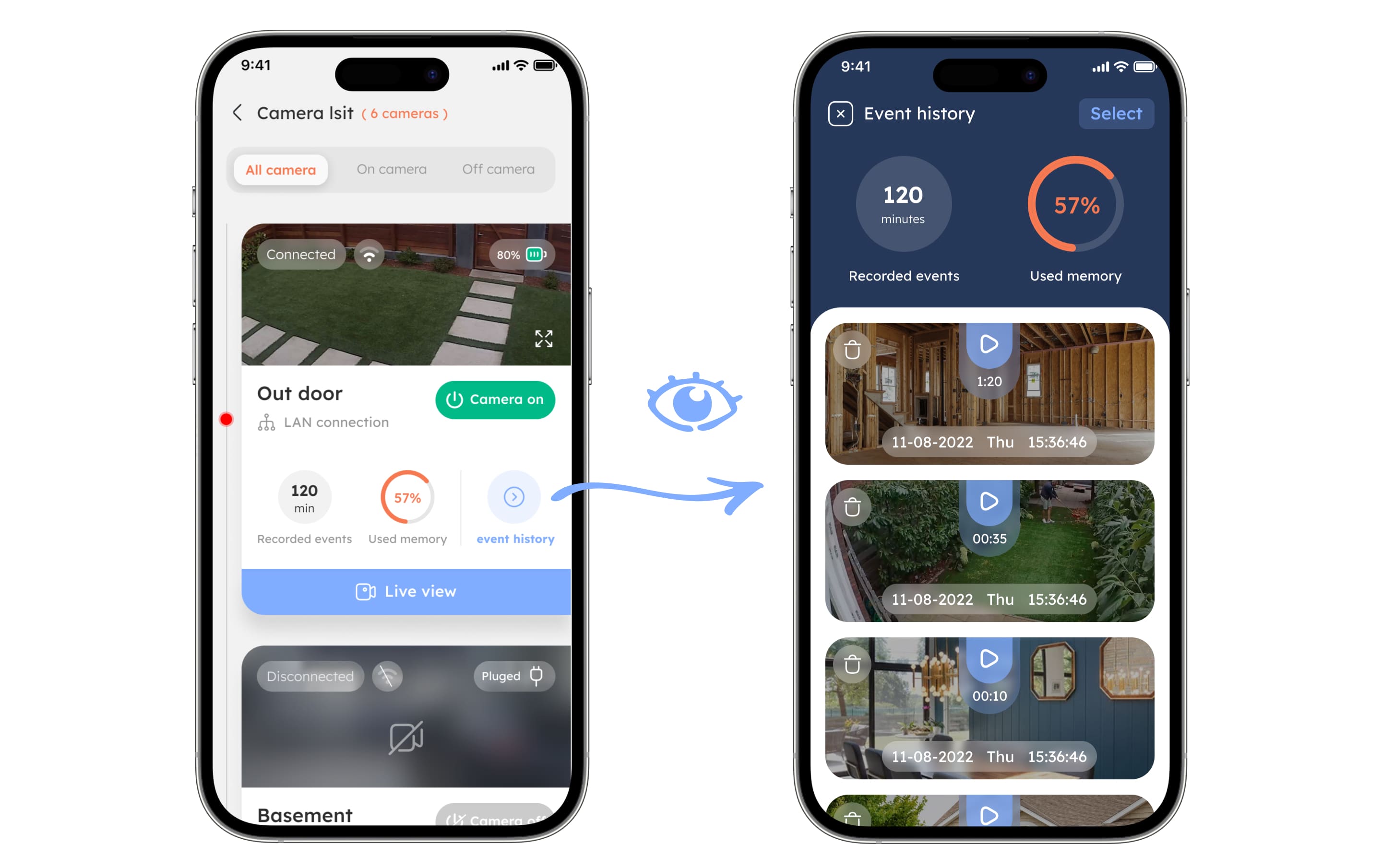 Each camera card shows live video with battery, connection, and storage at a glance, while event history keeps recent recordings instantly accessible.