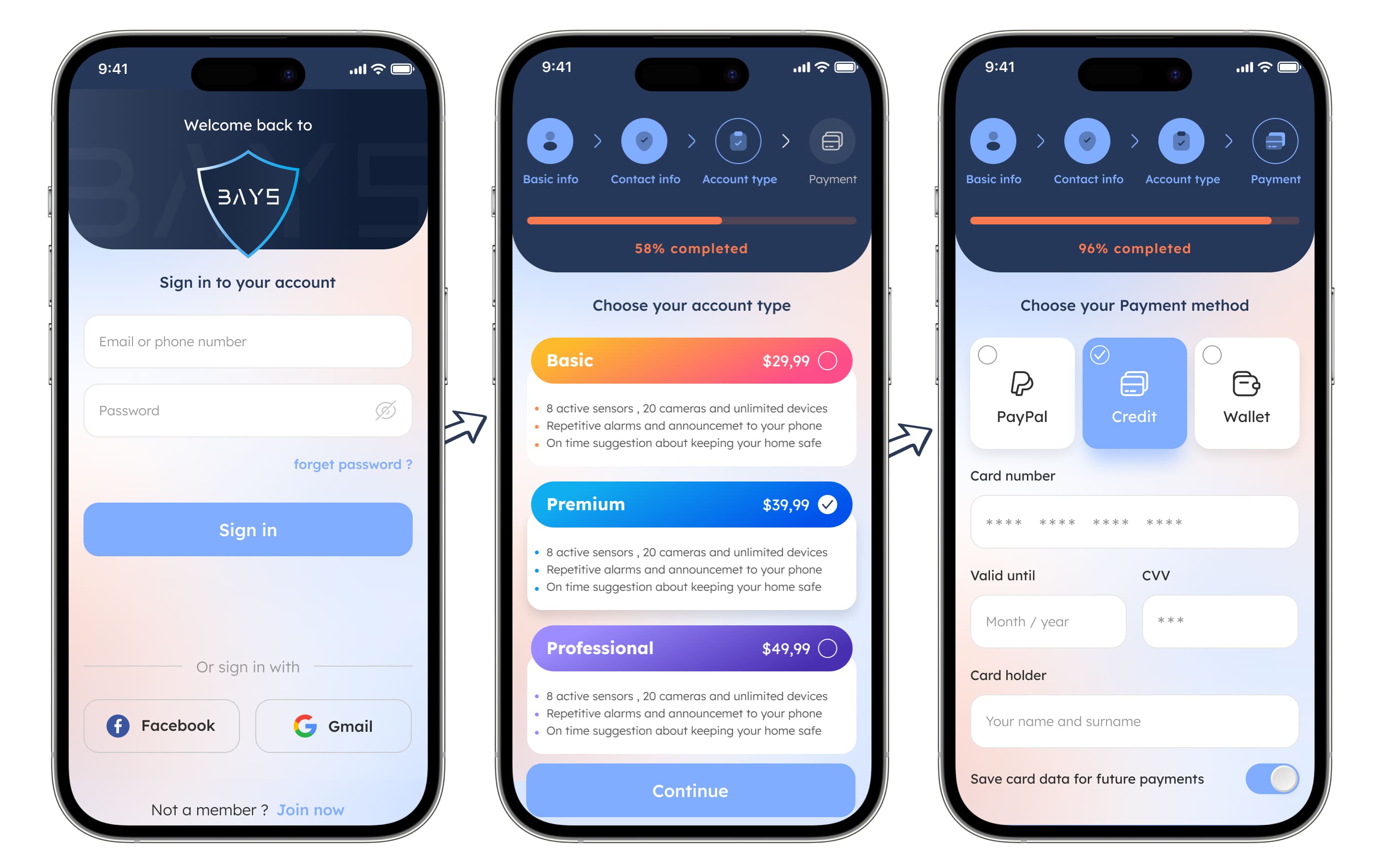 BAYS Secure is a smart home and IoT security app offering real-time control and monitoring of everything from live camera streams to leak alerts and smart locks. My role was to bring this experience to life through a clean, trustworthy visual design system, building intuitive interfaces, a cohesive UI library, and a bold first visual identity that reflects safety, simplicity, and control at every touchpoint.