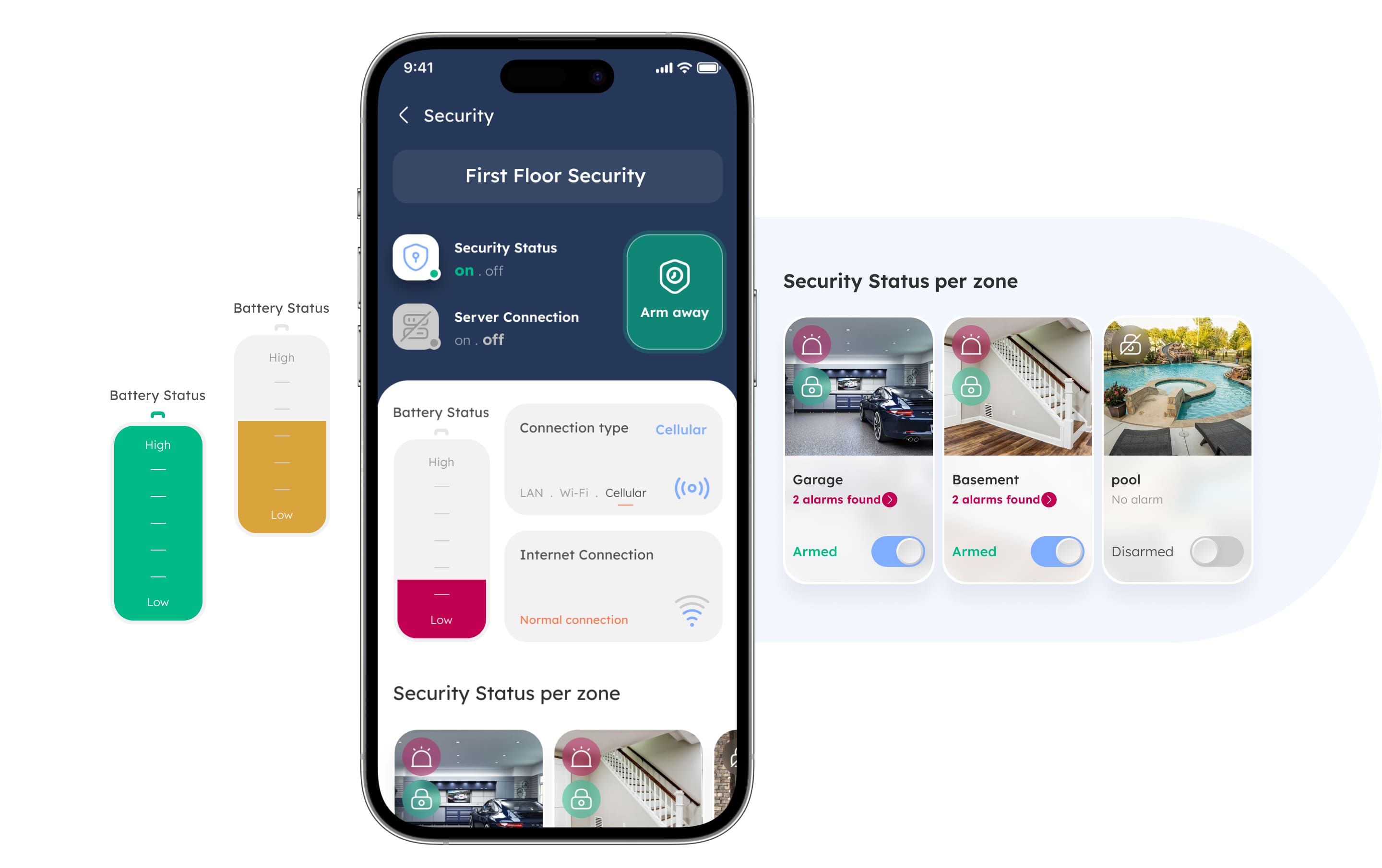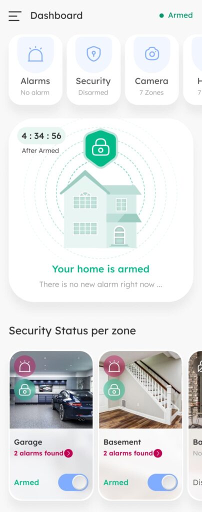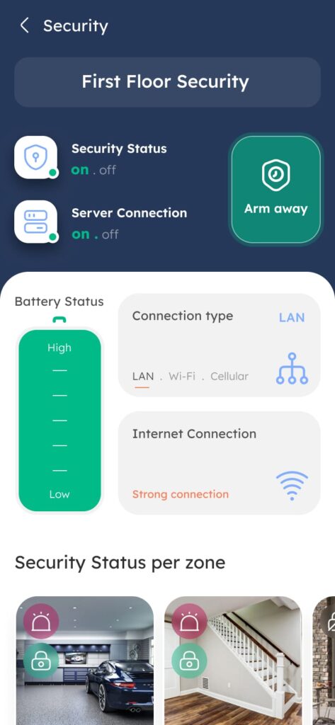 Each area of the house is shown with its own card, using icons and switches so users can instantly see battery, alarms, and arm/disarm zones without reading details.