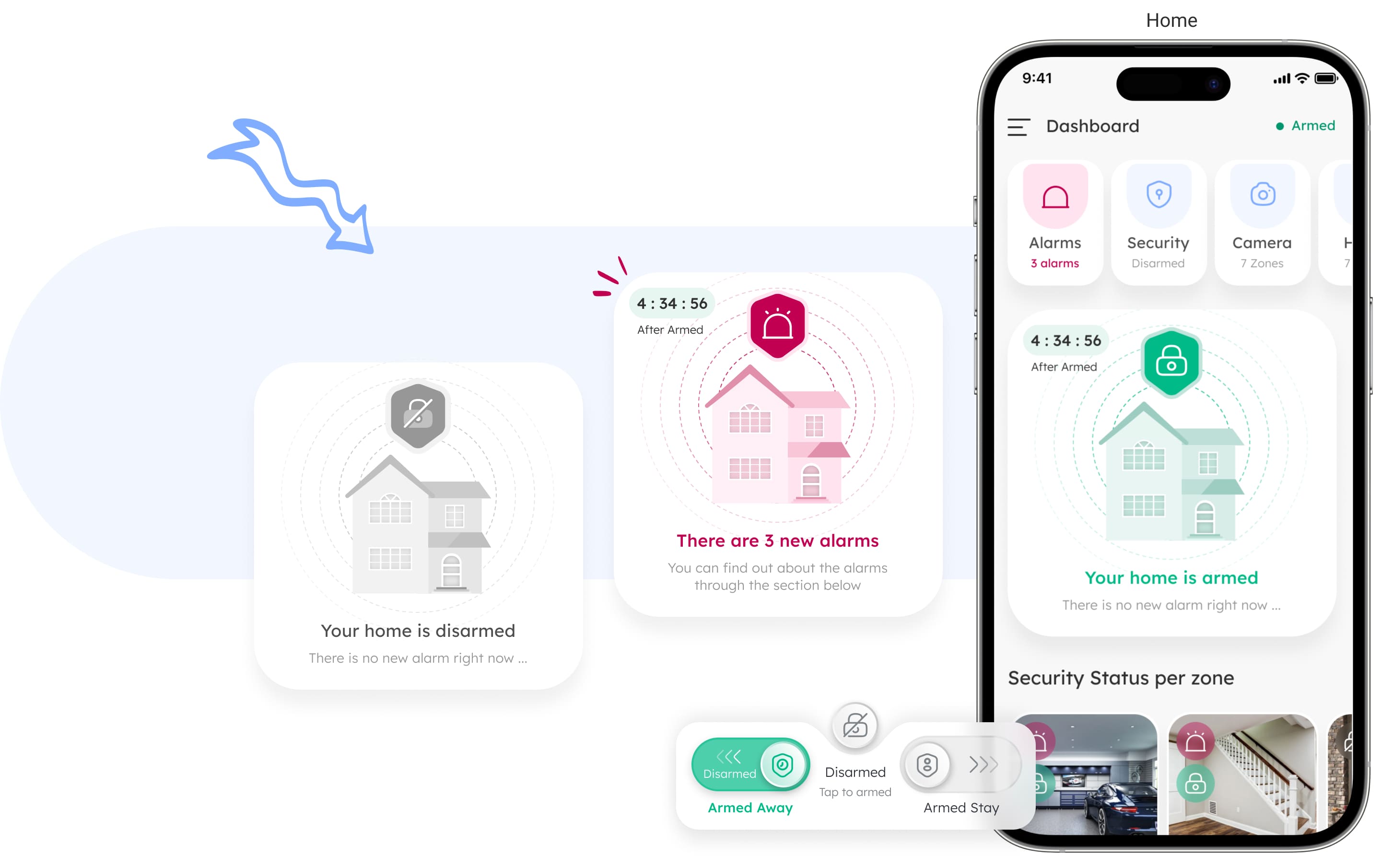 Color-coded states and custom icons let users see armed, disarmed, or error status at a glance, reducing hesitation and cognitive load.