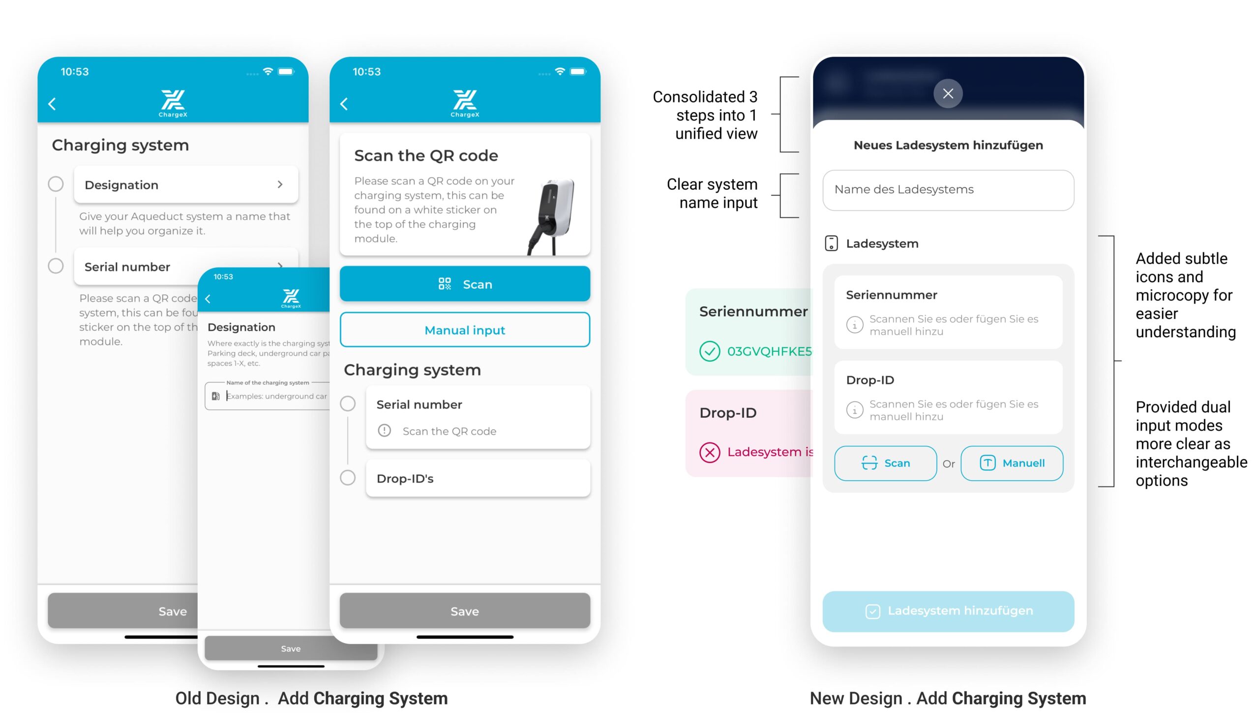 In the redesigned step, I strategically collapsed multi-screen flow into a single, well-structured screen. By removing unnecessary segmentation and combining related inputs, users now complete this task in one cohesive action. Clear grouping, icon-guided inputs, and dual options (Scan or Manual) reduce friction and make even first-time configuration feel intuitive.