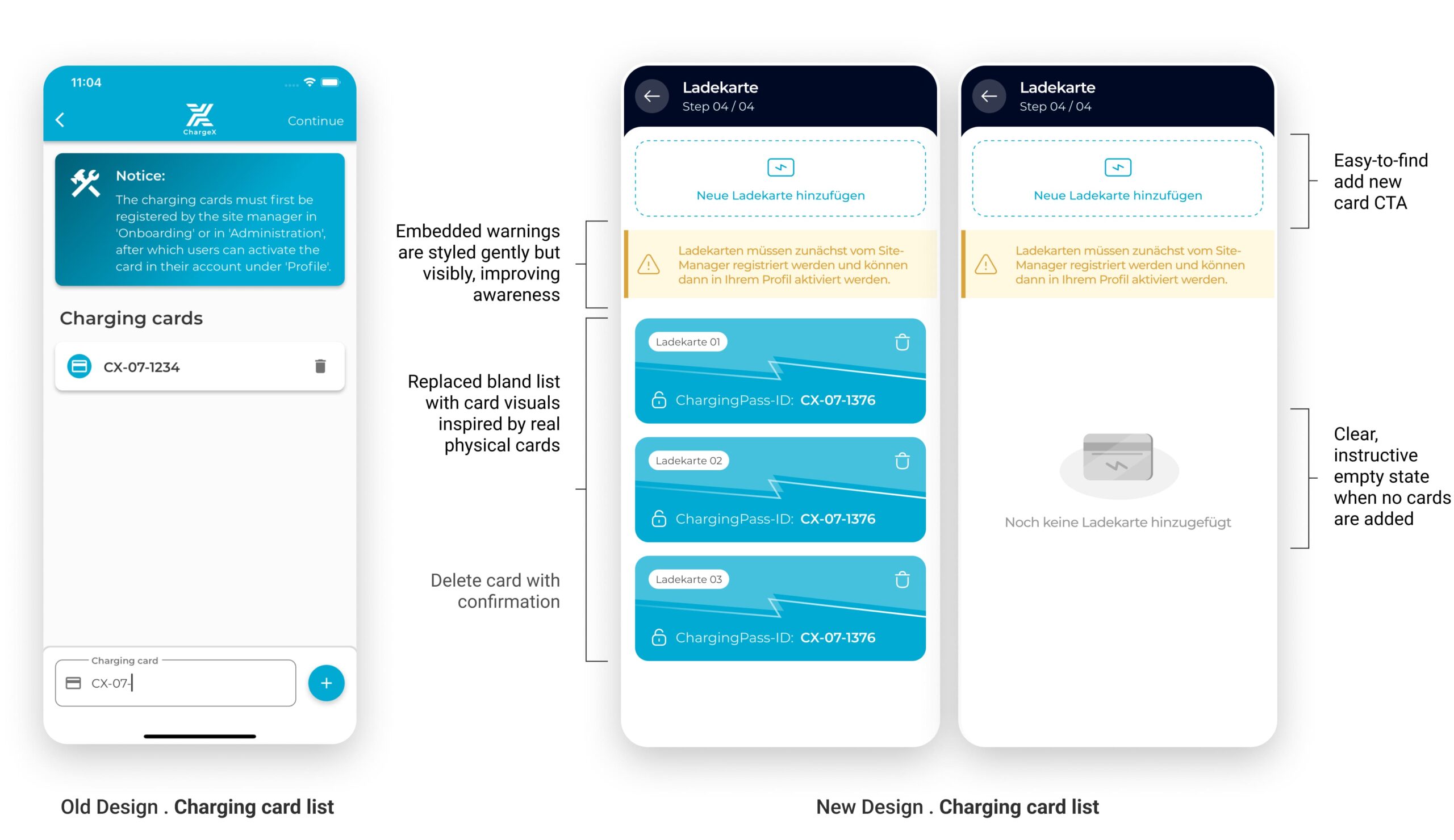 I reimagined this step by grounding the digital experience in something admins already know and trust: the physical charging card. By mimicking the actual card’s look, color, and structure, I bridged the physical-digital gap, making the system feel more intuitive, reliable, and self-explanatory.