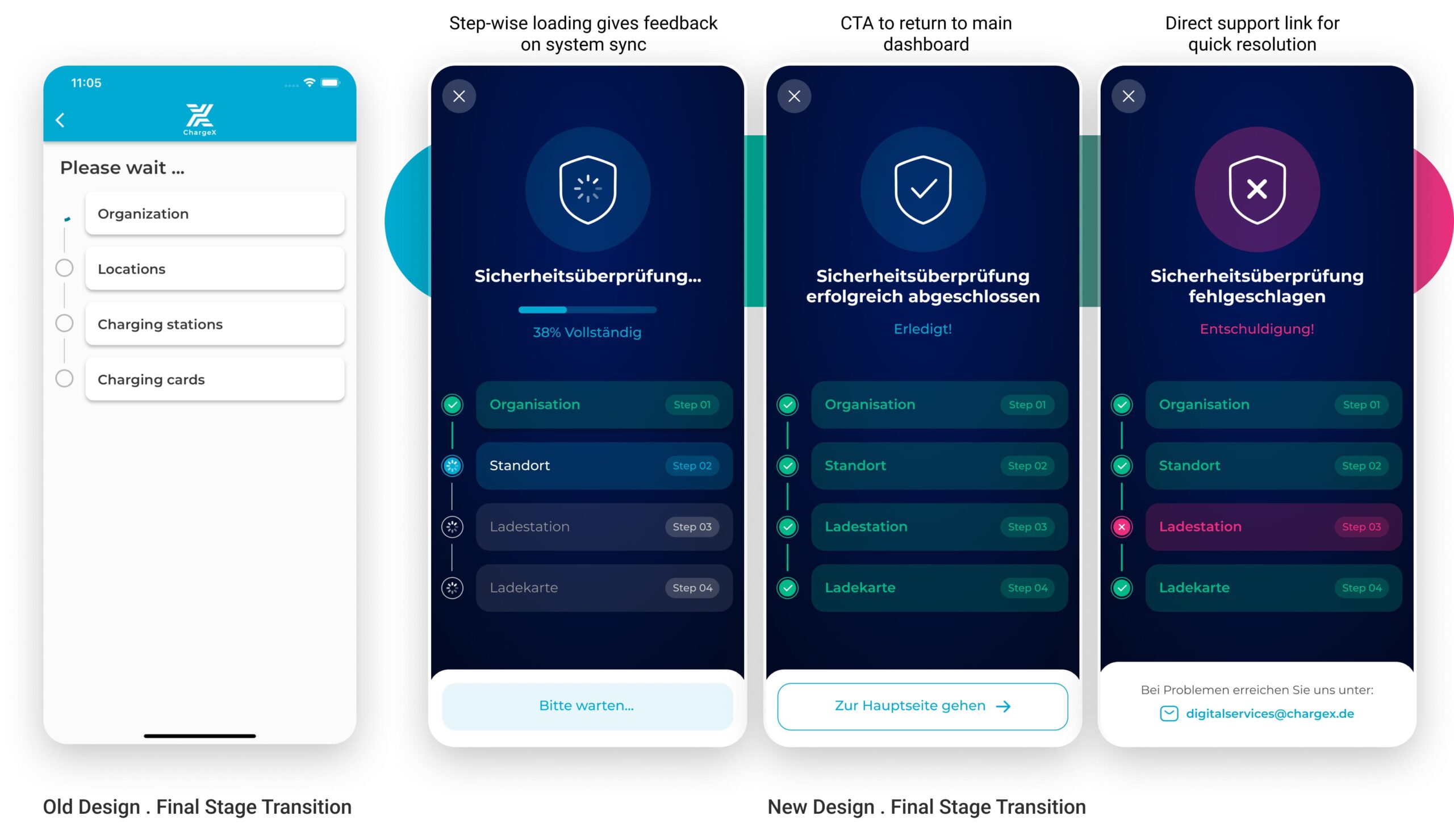 Three distinct states—progressing, success, and error—help users stay oriented and calm. The design uses metaphor (shield icons), clarity (color-coded steps), and actionable fallback (support email) to drive reliability and confidence at the final step of onboarding.
