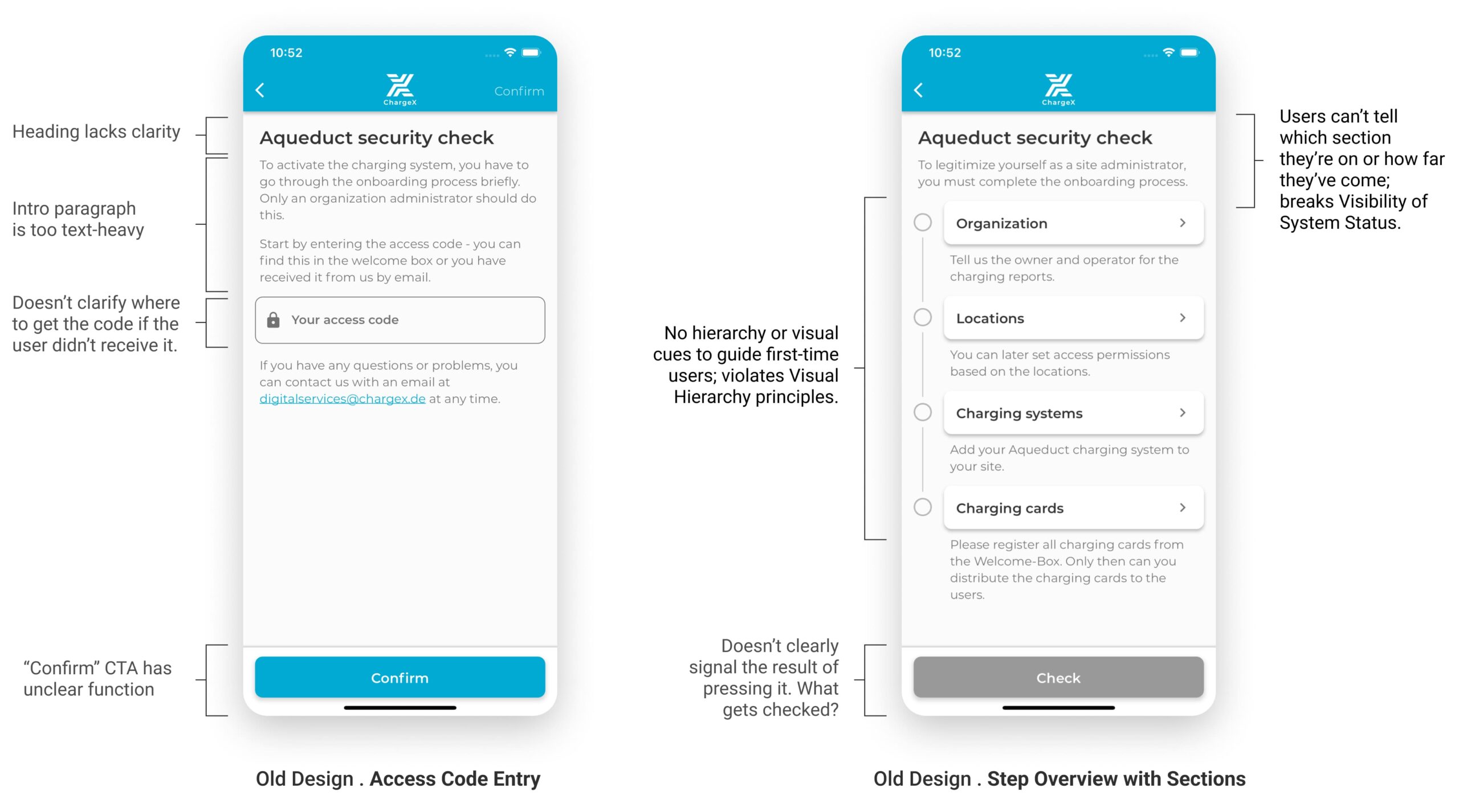 Instead of a clear entry point, admins faced dense instructions, ambiguous “Confirm” labels, and a step overview with no hierarchy. The very first interaction stalled progress rather than starting it.