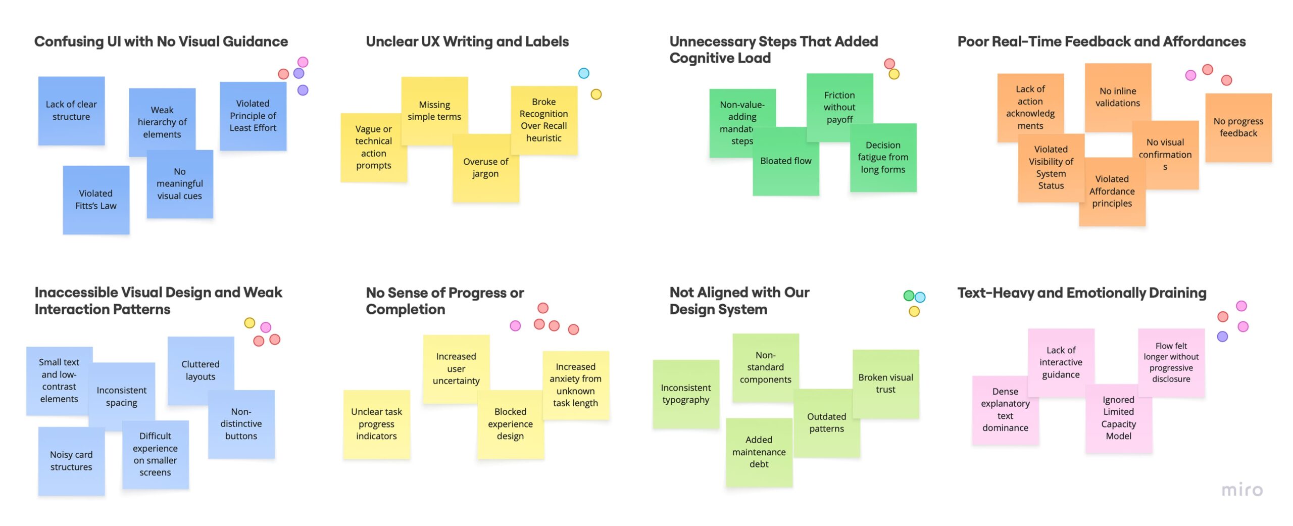 With ChatGPT clusters as input, I switched to Miro AI to map everything visually. This revealed overlaps between surface-level complaints and deeper UX breakdowns.
