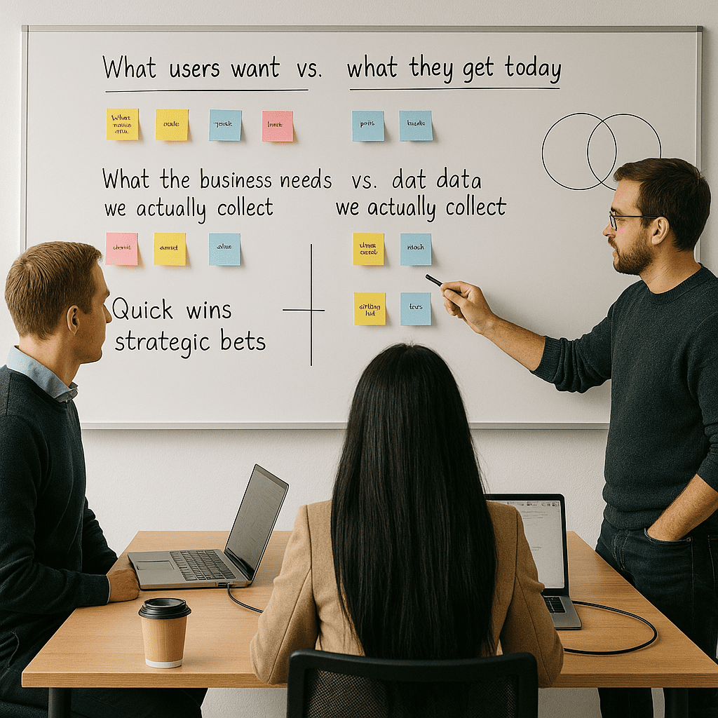 I brought PM and Engineering into a quick working session with the affinity map on one side and impact/effort on the other. We debated, dot-voted, and pressure-tested each theme.