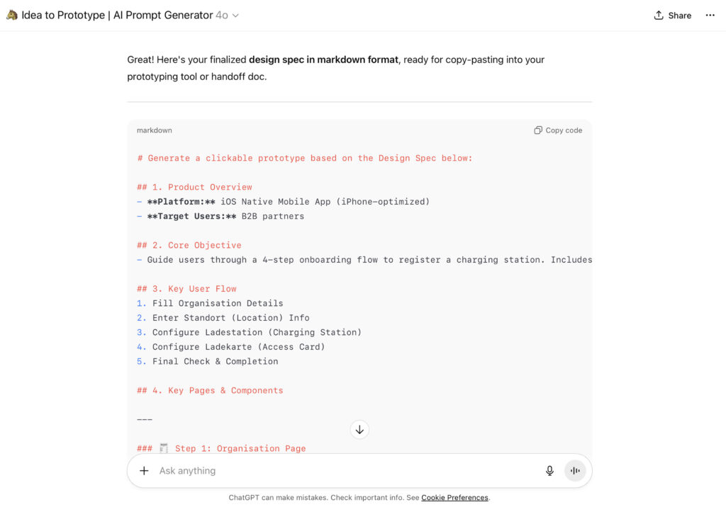 I wrote a markdown design spec using a custom GPT I built for myself. I described the prototype end-to-end—flow logic, step gating, inputs, validations, edge cases, and success/error states. My GPT turned that spec into ready-to-use prompts tailored for prototyping AIs.