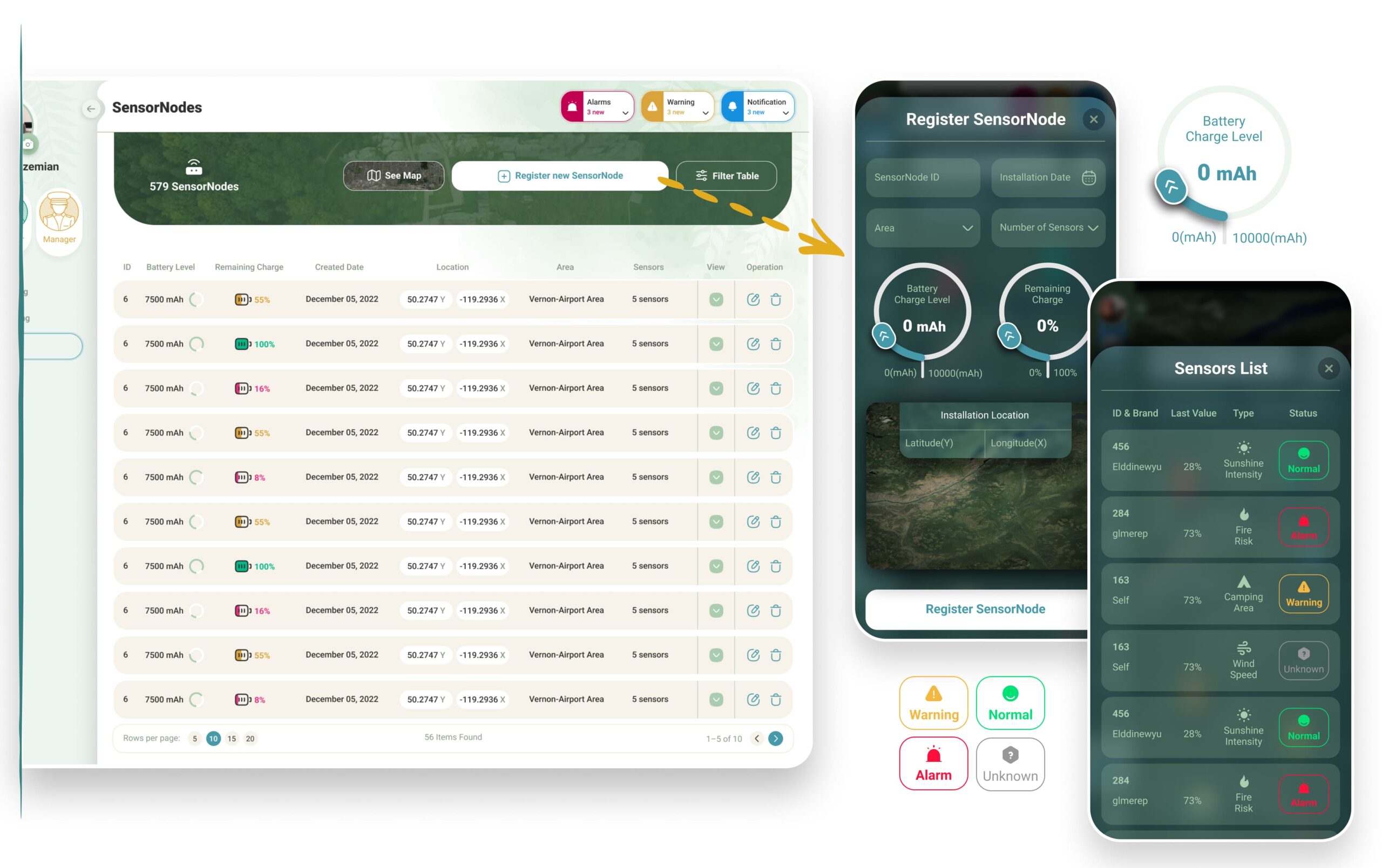 Dual table and map views let users scan hundreds of SensorNodes or drill into details, with colors and icons supporting quick interpretation.