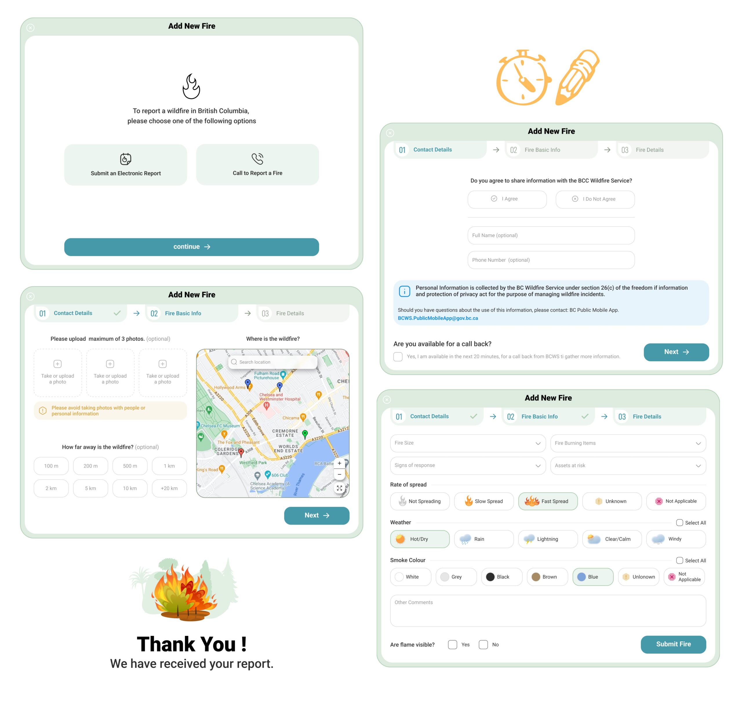 Step indicators and visual inputs replace heavy dropdowns, making wildfire reporting faster, lighter, and more intuitive.